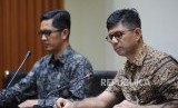 Juru Biacara KPK Febri Diansyah(kiri). Wakil ketua KPK Laode M Syarif (kanan) bersiap melakukan konfrensi pers di Kantor KPK, Jakarta, Ahad (4/2). (FOTO : Republika/Iman Firmansyah)
