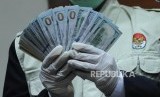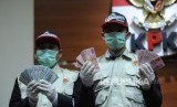 Petugas KPK menunjukan barang bukti yang didapat dalam konfrensi pers di Kantor KPK, Jakarta, Ahad (4/2). (FOTO : Republika/Iman Firmansyah)