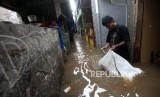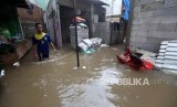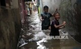 Sejumlah anak menerobos banjir yang merendam rumahnya akibat luapan Kali Ciliwung di Kebon Pala, Kampung Melayu, Jakarta, Senin (5/2). (FOTO : Republika/Mahmud Muhyidin)