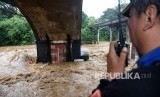 Petugas Tagana melihat tingkat ketinggian air sungai Ciliwung di pos pemantauan Jembatan Panus, Depok, Jawa Barat, Senin (5/2). (FOTO : Antara/Indrianto Eko Suwarso)