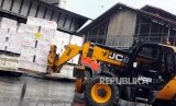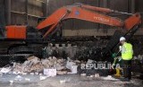 Pekerja mengangkut produk suplemen kesehatan Viostin DS menggunakan alat berat untuk dimusnahkan di PT. Prasadha Pamunah Limbah Industri, Nambo, Gunung Putri, Bogor, Jawa Barat, Kamis (8/2). (FOTO : Republika/Putra M. Akbar)