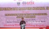 Presiden Republika Indonesia Ir Joko Widodo sedang betukar peran bersama jurnalis saat memberikan sambutan dalam acara puncak peringatan hari pers nasional 2018 di Danau Cimpago, Kota Padang, Provinsi Sumatra Barat, Jumat, (9/2). (FOTO : Republika/Iman Firmansyah)