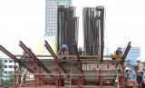 Penopang Pertumbuhan Ekonomi. Pekerja mengerjakan proyek LRT di Jakarta, Ahad (11/2). (FOTO : Republika/ Wihdan)