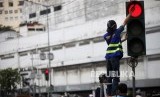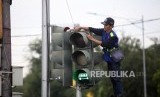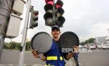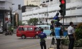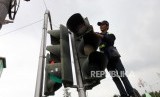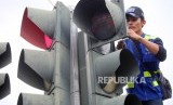 REPUBLIKA.CO.ID, JAKARTA -- Petugas Dinas Perhubungan DKI Jakarta memperbaiki lampu pengatur lalu lintas di Jalan Harmoni, Jakarta, Selasa (13/2).