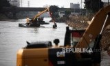 REPUBLIKA.CO.ID, JAKARTA -- Petugas menggunakan alat berat mengeruk endapan sampah bercampur lumpur di aliran sungai Ciliwung, Kawasan Pasar Baru, Jakarta, Selasa (13/2).