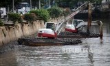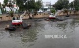 Petugas menggunakan alat berat melakukan pengerukan lumpur di Banjir Kanal Barat, Jakarta, Ahad (11/2). (FOTO : Republika/Mahmud Muhyidin)