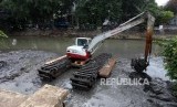 Petugas menggunakan alat berat mengeruk endapan sampah bercampur lumpur di aliran sungai Ciliwung, Kawasan Pasar Baru, Jakarta, Selasa (13/2). (FOTO : Republika/Mahmud Muhyidin)