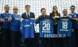 Legenda Inter Milan Javier Zanetti (ketiga Kiri) dan Presiden Inter Milan Erick Thohir (keempat kiri) memperlihatkan jersey Akademi Persib dan Inter Academy pada acara peluncuran Akademi Persib yang merupakan partnership program bersama Inter Academy di Stadion Siliwangi, Kota Bandung, Selasa (13/2). (FOTO : Republika/Edi Yusuf)