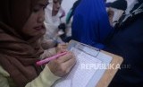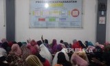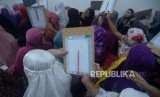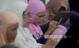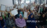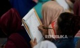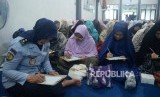 Sejumlah warga binaan mengikuti acara menghatamkan Al-Quran tulis dengan metode Follow The Line di Aula Lembaga Pemasyarakatan Perempuan Kelas II A, Pondok Bambu, Jakarta, Kamis (15/2). (FOTO : Republika/Prayogi)