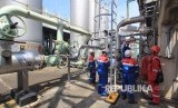 Pekerja memeriksa fasilitas pengolahan di Pertamina RU VI Balongan, Indramayu, Jawa Barat, Senin (19/2). Untuk mengantisipasi kecelakaan kerja, tim HSE Patrol melakukan pemantauan dan pengecekan fasilitas produksi kilang guna mencapai Zero Accident. (FOTO : Dedhez Anggara/Antara)