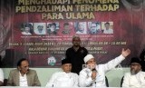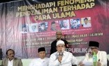 Ketua Dewan Penasihat Persaudaraan Alumni 212 Amien Rais (tengah) bersama Sekjen Komisi Nasional Anti Pemurtadan Bernard Abdul Jabar (kedua kanan) memaparkan penjelasan saat konferensi pers pada kegiatan Seminar Nasional Menghadapi Fenomena Pendzaliman Terhadap Para Ulama di Kantor Dewan Dakwah Islamiyah Indonesia, Jakarta, Selasa (20/2). (FOTO : Republika/Putra M. Akbar)