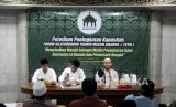 Sekretaris Forum Silaturahim Takmir Masjid (FSTM) Ustaz Ahmad Yani bersama DAI Muda Ustaz Soleh Sofyan dan Pimpinan Majelis Muwasholah Habib Al Qadri (dari kiri) memaparkan penjelasan saat kegiatan Pelatihan Peningkatan Kapasitas FSTM di Masjid Agung Sunda Kelapa, Jakarta, Kamis (22/2). (FOTO : Republika/Putra M. Akbar)