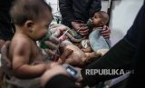Dua orang anak memperoleh penanganan medis setelah terpapar gas beracun di Desa Shifunieh, Ghouta Timur, Suriah, Ahad (25/2). (FOTO : Mohammed Badra/EPA-EFE)
