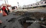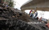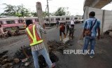 Sejumlah pekerja mengebor jalan untuk menutup jalan perlintasan kereta api di Kawasan Cipinang Lontar, Jakarta, Senin (5/3). (FOTO : Republika/Mahmud Muhyidin)