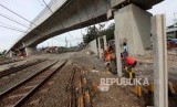 Sejumlah pekerja memasang pondasi beton untuk menutup jalan perlintasan kereta api di Kawasan Cipinang Lontar, Jakarta, Senin (5/3). (FOTO : Republika/Mahmud Muhyidin)