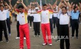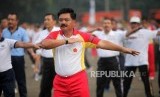 Panglima TNI Marsekal Hadi Tjahjanto melakukan senam saat olahraga bersama di Markas Besar TNI, Cilangkap, Jakarta, Selasa (6/3). (FOTO : Republika/Mahmud Muhyidin)