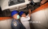 Menteri Perhubungan Budi Karya Sumadi mendengarkan penjelasan petugas saat meninjau aktifitas uji KIR gratis di Unit Pelayanan Teknis Daerah Pengujian Kendaraan Bermotor (UPTD PKB) Dinas Perhubungan Kota Tangerang, Banten, Selasa (6/3). (FOTO : Republika/Prayogi)