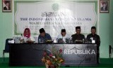 Menteri Luar Negeri Retno LP Marsudi, Wakil Presiden RI Jusuf Kalla, Sekjen MUI Anwar Abbas dan Wakil Ketua Umum MUI Zainut Tauhid (dari kiri) memberikan pernyataan usai melakukan pertemuan di Kantor MUI, Jakarta, Selasa (6/3). (FOTO : Republika/Putra M. Akbar)