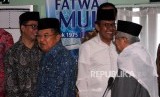 Wakil Presiden RI Jusuf Kalla (kedua kiri) dan Ketua Majelis Ulama Indonesia (MUI) KH. Ma'ruf Amin (kanan) berjalan saat akan melakukan pertemuan di Kantor MUI, Jakarta, Selasa (6/3). (FOTO : Republika/Putra M. Akbar)