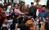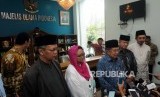 Menteri Luar Negeri Retno LP Marsudi (kedua kanan), Wakil Presiden RI Jusuf Kalla (kanan) memberikan pernyataan usai melakukan pertemuan di Kantor MUI, Jakarta, Selasa (6/3). (FOTO : Republika/Putra M. Akbar)