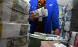 Petugas menata tumpukan uang rupiah dan dolar Amerika di Cash Center Bank Mandiri, Jakarta, Rabu (7/3). Bank Indonesia menyatakan cadangan devisa Indonesia pada akhir Februari 2018 menurun 3,92 miliar dolar Amerika menjadi 128,06 miliar dolar Amerika dibandingkan bulan Januari 2018 sebagai imbas untuk stabilisasi nilai tukar rupiah dan pembayaran utang luar negeri. (FOTO : Sigid Kurniawan/Antara)