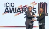 Presiden Direktur PT Bank CIMB Niaga Tbk Tigor M. Siahaan (kiri) menerima plakat penghargaan untuk kategori The Most Isnpiring CEO yang diserahkan oleh Founder iCIO Community Harry Surjanto pada ajang iCIO Award 2018 di Jakarta, Rabu (7/3). (FOTO : Darmawan/Republika)