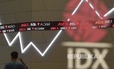 Seorang karyawan melintas di dekat layar pergerakan Indeks Harga Saham Gabungan (IHSG) di Bursa Efek Indonesia, Jakarta, Rabu (7/3). IHSG ditutup melemah 131,84 poin atau 2,03 persen ke level 6.368,27. (FOTO : Sigid Kurniawan/Antara)