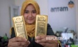 Seorang karyawan PT Aneka Tambang (Antam) menunjukkan imitasi logam mulia di Medan, Sumatera Utara, Rabu (7/3). Harga emas batangan bersertifikat PT Aneka Tambang (Antam) mengalami kenaikan Rp8.000 dibandingkan penutupan Selasa (6/3) lalu menjadi Rp660.000 per gram. (FOTO : Septianda Perdana/ANTARA)