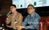 Direktur Utama Bank Mandiri Syariah Toni EB Subari bersama Risk Management and Compliance Director Bank Mandiri Syariah Putu Rahwidhiyasa (dari kiri) memberikan paparan saat konferensi pers Kinerja Mandiri Syariah Tahun 2017 di Al Jazeerah Signature, Menteng, Jakarta, Kamis (8/3). (FOTO : Republika/Putra M. Akbar)