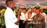 Menteri Koordinator Perekonomian Darmin Nasution (kanan) dan Head of Communications and Public Affairs, berbincang dengan siswa SMK Negeri 1 Kumbe -Merauke Yoshua M. Mahuse (kiri), didampingi Bayer Indonesia di ajang Jakarta Food Security Summit 2018, Jakarta, Kamis (8/3). Bayer melalui 'Program Pelatihan Kejuruan Pertanian di Merauke’ dan pengenalan teknologi Digital Farming, menarik perhatian generasi muda agar mau menggeluti sektor pertanian. (FOTO : Dok Bayer)