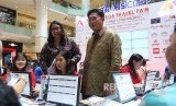 Direktur Utama Bank Mega, Kostaman Thayib (kanan) dan Direktur Tour & Retail AntaVaya, Ida Wijanty (kiri) meninjau booth pada acara Mega Travel Fair periode I di Jakarta, Kamis (8/3). Acara yang sama digelar di 12 kota besar di Tanah Air dengan target penjualan total Rp 350 miliar. (FOTO : Aprillio Akbar/Antara)