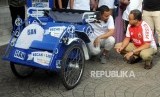 Gubernur DKI Jakarta Anies Baswedan melihat becak listrik yang diberikan oleh Wakil Ketua Umum DPP Partai Amanat Nasional Hanafi Rais (dari kiri) di Balaikota Jakarta, Ahad (11/3). (FOTO : Republika/Putra M. Akbar)