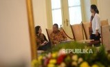 Terima Delegasi AIIB. Menkeu Sri Mulyani, Menko Perekonomian Darmin Nasution, dan Menteri BUMN Rini Soemarno (dari kiri) menunggu pertemuan bersama delegasi Asian Infrastructure Investment Bank (AIIB) di Istana Kepresidenan Bogor, Jawa Barat, Senin (12/3). (FOTO : Republika/ Wihdan)