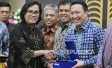 Menteri Keuangan Sri Mulyani(kiri) memberikan penghargaan kepada Presiden Direktur Pt Adaro Indonesia T bk Garibaldi Thohir(kanan) dalam acara Apresiasi dan Penghargaan Wajib Pajak Kanwil DJP pajak besar tahun 2018 di lingkungan Kanwil DJP Wajib Pajak Besar, Jakarta, Selasa (13/3). (FOTO : Republika/Iman Firmansyah)