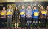 Erick Thohir( kedua kanan) berfoto bersama menteri keuangan (ketiga kiri) dalam acara Apresiasi dan Penghargaan Wajib Pajak Kanwil DJP pajak besar tahun 2018 di lingkungan Kanwil DJP Wajib Pajak Besar, Jakarta, Selasa (13/3). (FOTO : Republika/Iman Firmansyah)