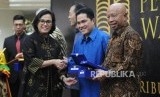 Menteri Keuangan Sri Mulyani(kiri) memberikan penghargaan kepada Erick Thohir(tengah) dalam acara Apresiasi dan Penghargaan Wajib Pajak Kanwil DJP pajak besar tahun 2018 di lingkungan Kanwil DJP Wajib Pajak Besar, Jakarta, Selasa (13/3). (FOTO : Republika/Iman Firmansyah)