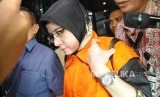 Panitera Pengganti PN Tangerang Tuti Atika yang terjaring operasi tangkap tangan (OTT) mengenakan rompi tahanan seusai diperiksa di gedung KPK, Jakarta, Selasa (13/3). (FOTO : Republika/Iman Firmansyah)