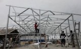 Pekerja menyelesaikan pembangunan shelter tempat tinggal sementara di Kampung Akuarium, Jakarta, Selasa (13/3). (FOTO : Republika/Mahmud Muhyidin)