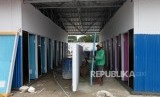 Petugas memeriksa pembangunan shelter tempat tinggal sementara yang sudah selesai di Kampung Akuarium, Jakarta, Selasa (13/3). (FOTO : Republika/Mahmud Muhyidin)