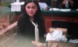 Artis Vicky Veranita Yudhasoka Shu memberikan keterangan saat menjalani sidang lanjutan sebagai saksi dalam kasus penipuan dan penggelapan oleh agen perjalanan umrah First Travel di Pengadilan Negeri Depok, Jawa Barat, Rabu (14/3). (FOTO : Republika/Mahmud Muhyidin)