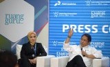 Menteri Komunikasi dan Informatika Rudiantara (kanan) bersama Direktur Sumber Daya Manusia Pertamina Nicke Widyawati menjadi pembicara pada konferensi pers Learning Innovation Summit 2018 di Jakarta, Rabu (14/3). Pertamina bersama dengan Ruangguru menyelenggarakan konferensi pendidikan internasional bertajuk (FOTO : Wihdan Hidayat/Republika)