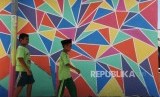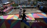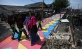 Sejumlah anak melintas dijalan yang berwarna warni di kawasan kampung nelayan Kamal Muara, Jakarta, Kamis (15/3). (FOTO : Republika/Mahmud Muhyidin)