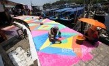 Warga mengecat jalan di kawasan kampung nelayan Kamal Muara, Jakarta, Kamis (15/3). (FOTO : Republika/Mahmud Muhyidin)