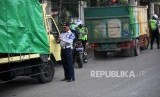 Petugas kepolisian dan Dinas Perhubungan memeriksa surat kendaraan truk dan motor saat Operasi Lintas Jaya 2018 di Kawasan Kamal Raya, Jakarta, Kamis (15/3). (FOTO : Republika/Mahmud Muhyidin)