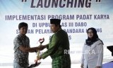 Bupati Kepulauan Anambas Abdul Haris (tengah) memberikan cangkul kepada perwakilan kontraktor sebagai simbolis launching Implementasi Program Padat Karya di Bandar Udara Letung, Kecamatan Jemaja Timur, Kabupaten Kepulauan Anambas, Riau, Jumat (16/3). (FOTO : Republika/Putra M. Akbar)