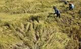 Petani memotong padi yang rebah akibat diterpa angin di Desa Lampuuk, Kua Baro, Kabupaten Aceh Besar, Aceh, Sabtu (17/3). Menteri Pertanian Andi Amran Sulaiman meminta Perum Bulog mempercepat penyerapan gabah petani agar harga tetap stabil seiring panen raya yang mulai berlangsung di sejumlah daerah sentra produksi, dengan target serapan sebesar 2,2 juta ton beras hingga Juni 2018. (FOTO : Ampelsa/Antara)