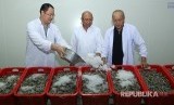 Presiden Direktur PT Panca Mitra Multi Perdana Martianus Suesilo (kiri) bersama Wakil Direktur Utama Hirawan Tedjokoesomo (tengah) dan Komisaris Utama Soesilo Soebardjo (kanan) memeriksa udang di pabrik pengolahan udang di Situbondo, Jawa Timur, Minggu (18/3). PT Panca Mitra Multiperdana merupakan salah satu eksportir udang beku terbesar di Indonesia, yang pada 2018 mentargetkan 20 ribu ton untuk memenuhi kebutuhan pasar ekspor Amerika dan Jepang. (FOTO : Budi Candra Setya/Antara)