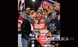 Rider Ducati Team Andrea Dovizioso (tengah) merayakan kemenangannnya pada MotoGP Qatar di Losail International Circuit, Doha. (FOTO : Noushad Thekkail/EPA-EFE)