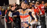 Rider Honda Repsol Marc Marquez merayakan keberhasilan menempati posisi kedua pada MotoGP Qatar di Losail International Circuit, Doha. (FOTO : Noushad Thekkail/EPA-EFE)