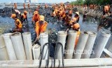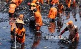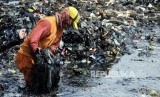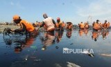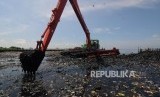 REPUBLIKA.CO.ID, JAKARTA -- Sejumlah petugas saat membersihkan sampah yang menumpuk di Muara Angke, Jakarta Utara Senin (19/3).